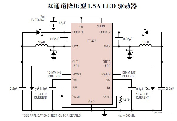 LTC3475以其寬的輸入電壓范圍(4V~36V,max40V),可調(diào)節(jié)含汽車動(dòng)力系統(tǒng)在內(nèi)的廣闊的電源陣列。它的開(kāi)關(guān)頻率調(diào)節(jié)幅度為200kHz~2MHz,能利用很小的電感器和陶瓷電容器,與耐熱的TSSOP-16組件結(jié)合,在驅(qū)動(dòng)2個(gè)或4個(gè)大電流LED時(shí),可提供結(jié)構(gòu)非常緊湊的解決方案。