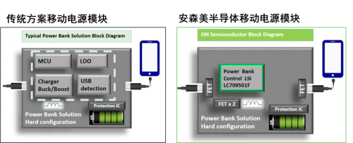 圖3:移動(dòng)電源之傳統(tǒng)方案架構(gòu)對比安森美半導(dǎo)體方案架構(gòu)
