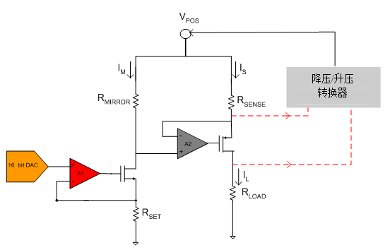 由放大器A1建立的回路將DAC輸出電壓轉(zhuǎn)換成電流。通過負(fù)反饋,放大器A1將RSET兩側(cè)的電壓設(shè)置為等于DAC輸出。RSET兩側(cè)的這個電壓降將設(shè)定流過第一級IM的電流。(假設(shè)IRSET等于IM的理想情況)。通過使用由放大器A2和RMIRROR和RSENSE電阻對的組合建立的回路,產(chǎn)生的電流IM進(jìn)一步被增益。放大器A2將強(qiáng)制RSENSE兩側(cè)的電壓等于VMIRROR。通過與RMIRROR和RSENSE的比例成正比的因子,這產(chǎn)生了從IM增益的負(fù)載電流。如圖1所示,RLOAD通常表示線性執(zhí)行器負(fù)載,如同PLC系統(tǒng)的情況。由于目前通過RMIRROR不提供負(fù)載,這將直接降低系統(tǒng)的效率。良好的設(shè)計實(shí)踐是將該電流最小化,將其設(shè)置為小于輸出電流的1%。出于計算的目的,假設(shè)RMIRROR和RSENSE之間的高比率(> 1到100),我們忽略IM。