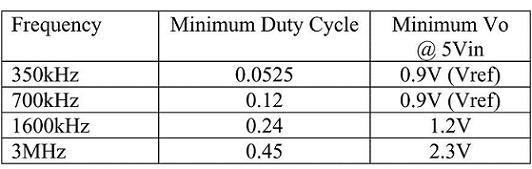 上面例子中的TPS54317型轉換器任務周期為0.36 (1.8V/5.0V),最小啟動時間為數據表中所示的150ns(最大值)。可控制脈寬的限制產生了可獲得的最小任務周期,根據等式3可以很容易算出來。一旦知道了最小任務周期,就可以計算出最低可獲取輸出電壓,如等式4和表格2中所示。最低輸出電壓也受到轉換器參考電壓限制,TPS54317的最低輸出電壓為0.9V。