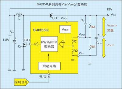 圖2是產生LCD用正電壓和負電壓的應用電路,它用一個升壓DC/DC變換器來產生正負電壓。電路中使用了VDD/VOUT分離型器件S-8356Q50,在Vout端子接口,通過使用電阻對輸出電壓進行分壓,這樣可以調整輸出電壓。通過R1和R2正電壓可以達到很高,負電壓可以通過C1、SD3、SD2使正電壓反轉為負電壓。