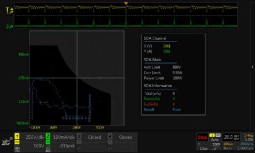 示波器的測(cè)試應(yīng)用非常簡單,使用電壓、電流探頭正常測(cè)試開關(guān)管的VDS和IDM,并打開SOA分析功能,對(duì)照數(shù)據(jù)手冊(cè)的SOA數(shù)據(jù)設(shè)置好示波器的SOA參數(shù)即可。一但波形觸碰到安全區(qū)以外的區(qū)域,就說明器件超額工作,存在危險(xiǎn)。