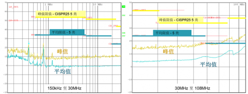 圖 7 顯示了典型的 CISPR 25 傳導(dǎo) EMI 掃描結(jié)果,黃色和藍(lán)色分別表示峰值和平均測量值。我們可以看到 DC/DC 轉(zhuǎn)換器安靜地運(yùn)行,傳導(dǎo)發(fā)射遠(yuǎn)低于嚴(yán)格的 5 類限值。這種測量技術(shù)在 30MHz 以上發(fā)生改變,因?yàn)?EMI 接收器的 RBW 從 9kHz 調(diào)整為 120kHz,可能導(dǎo)致測量噪底發(fā)生變化。