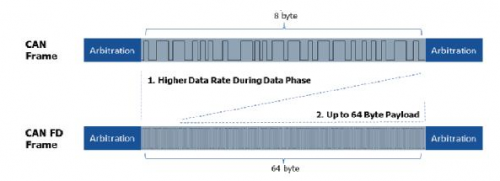車載以太網雖然可以解決數據量的問題,但其布線改變過大,成本上升過多,只適合于網關之間的通訊。所以CiA協議就聯合各大車廠,制定出新一代的CANFD協議,以快速升級現有的CAN2.0B。其主要的內容就是將一幀的數據段由8字節提升到64字節,同時可以提升數據段的波特率,以縮短通訊時間。如圖1所示。