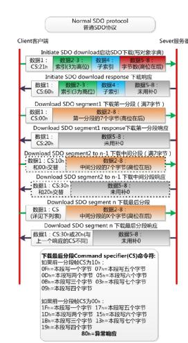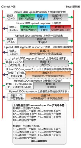 成熟的應用層協議都有可靠的分幀協議,比如CANopen,DeviceNET,J1939協議等,總的方針都是“握手”“傳輸”“確認”“結束”這四個過程循環。這里只介紹CANopen協議中的SDO多幀傳輸。
